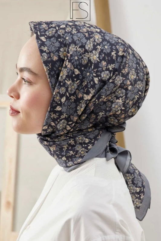 Blooming Garden Patterned Cotton Silk Scarf Navy Blue